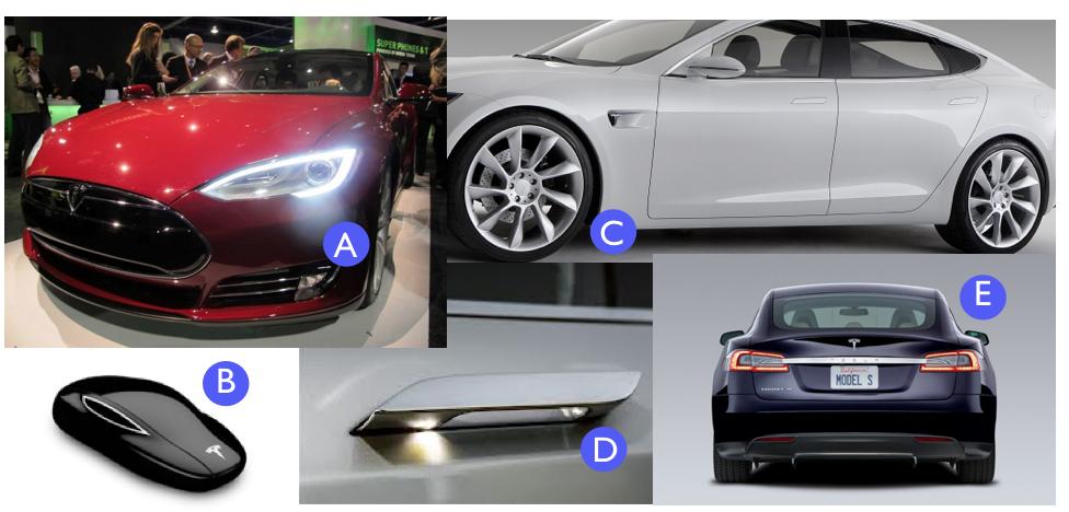 E. Great design symmetry: By curving the side windows and tapering the interior cabin width, Tesla has created a look that is equal parts sedan and super car. From the side angle, it looks like a balanced sedan, but from the backside, it appears powerful with a low center of gravity more characteristic of a super-car. Again, they have managed to do this while maintaining an under-stated image.