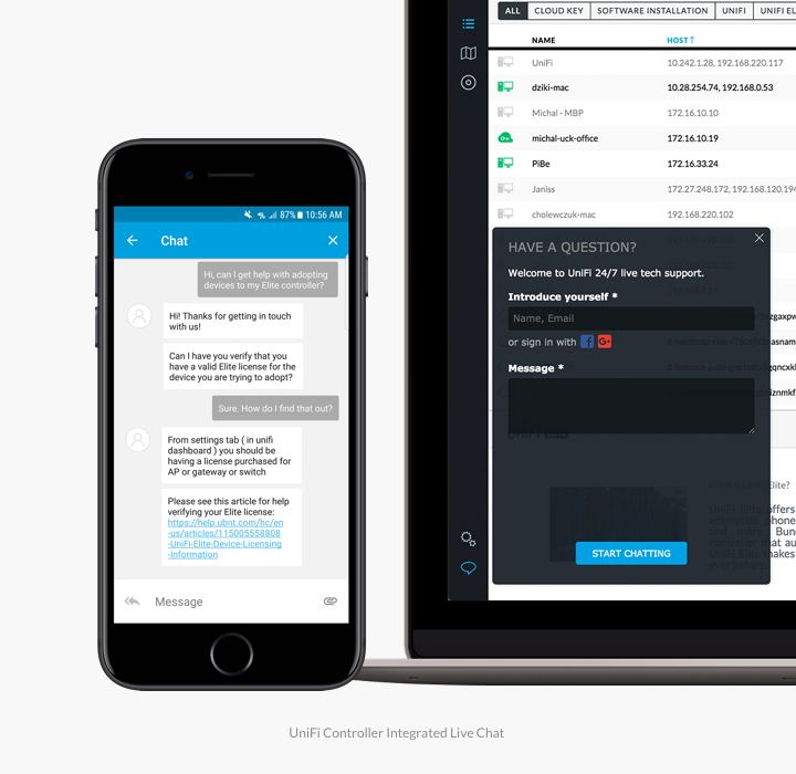 It is widely known that Ubiquiti hosts a powerful community of system integrators who, together with our R&D, evangelize, improve, and support the UniFi platform. But UniFi also offers very responsive email support and real-time 24/7 online chat built into the controller, available free of charge.